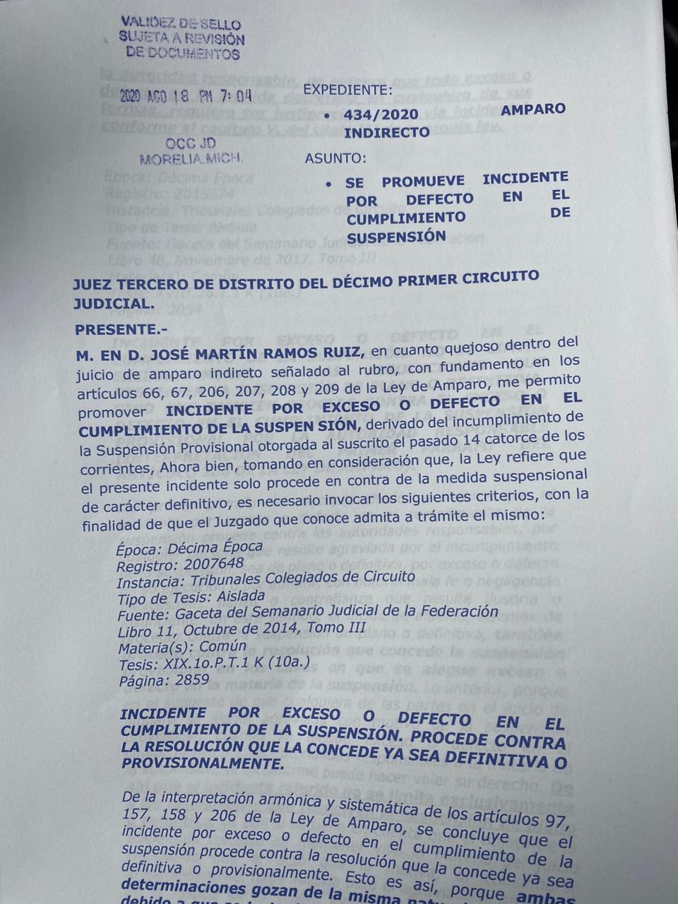 Es necesario destacar que el amparo fue promovido el pasado 7 de agosto por el equipo jurídico de Acción Nacional, para solicitar la obligatoriedad en la aplicación de medidas sanitarias durante la rendición del Segundo Informe de Gobierno del alcalde de Morelia.