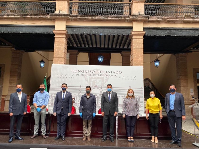 Por su parte, el diputado David Cortés Mendoza acudió a los hospitales de Morelia a entregar cubrebocas N95, lentes, overoles y gorros quirúrgicos, caretas y gel antibacterial.